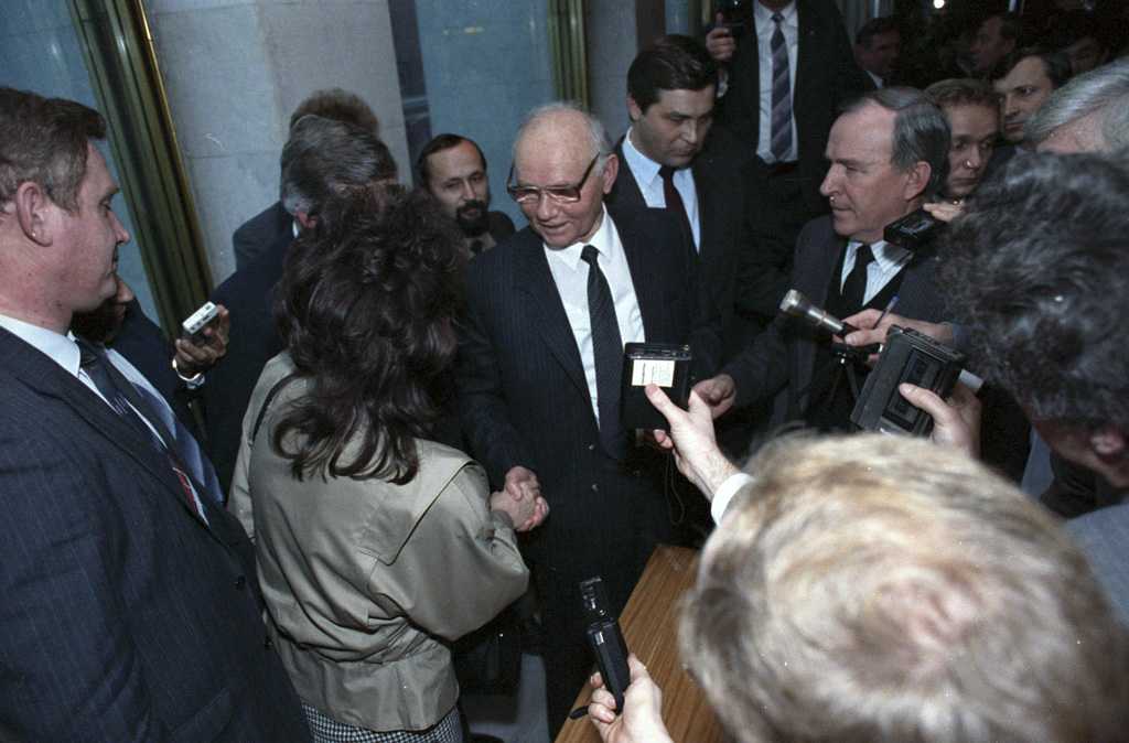 Председатель Комитета государственной безопасности СССР Владимир Крючков дает интервью журналистам. Кремлевский дворец съездов. 1 декабря 1990 года. Фото: wikipedia.org