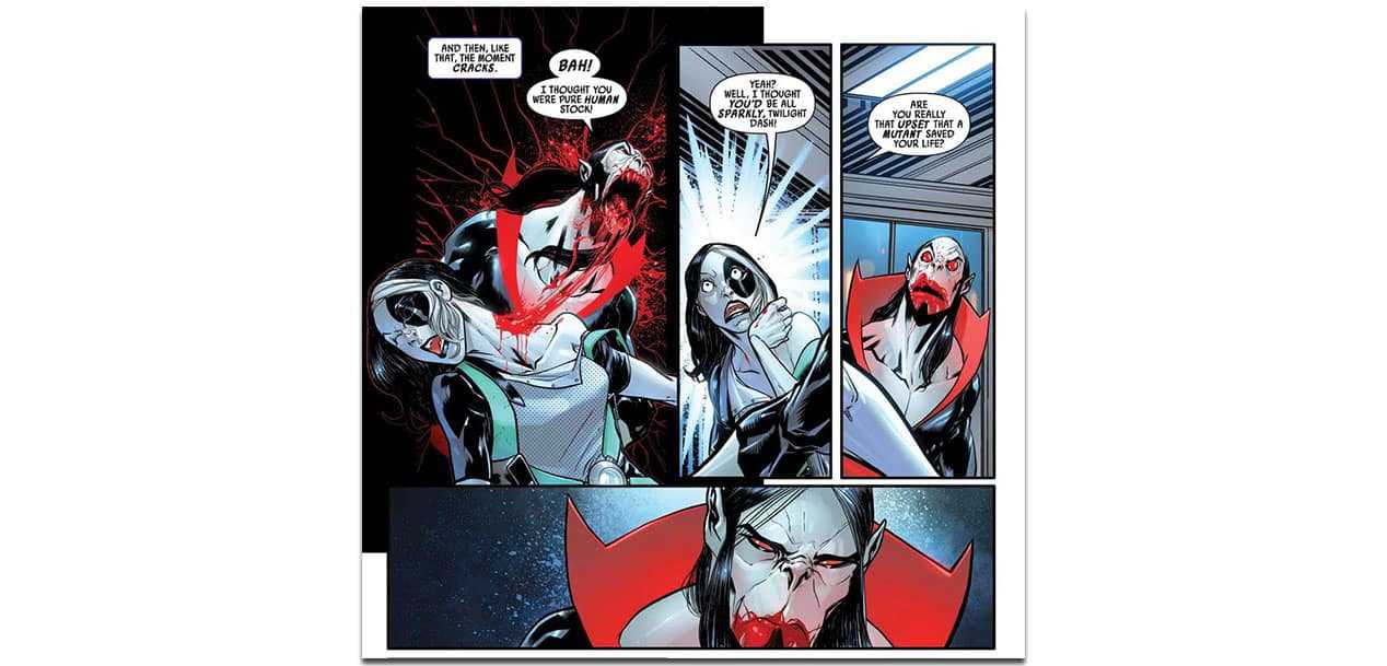 Впервые появившись в Новый Человек-Паук # 101 в 1971 г., Морбиус, «Живой вампир» — исторически важный персонаж по двум причинам. Он был первым Человек-паук злодей, созданный не со Стэном Ли, он появился в первом выпуске после того, как Ли покинул ежемесячный журнал. Удивительный человек паук заглавие. Морбиус также известен как первый персонаж-вампир, появившийся в книге Marvel Comics на протяжении большей части двух десятилетий, благодаря Закону о комиксах 1954 года, запрещающему изображение «вампиры и вампиризм. »Пересмотр CCA 1971 года позволил изображать и вампирских существ, и вампиров в манере, совместимой с классическими работами, такими как Брэм Стокер. Дракула, прокладывая путь для вампиров, таких как Морбиус и сам Дракула, к приобретению собственной серии комиксов Marvel, Могила Дракулы.