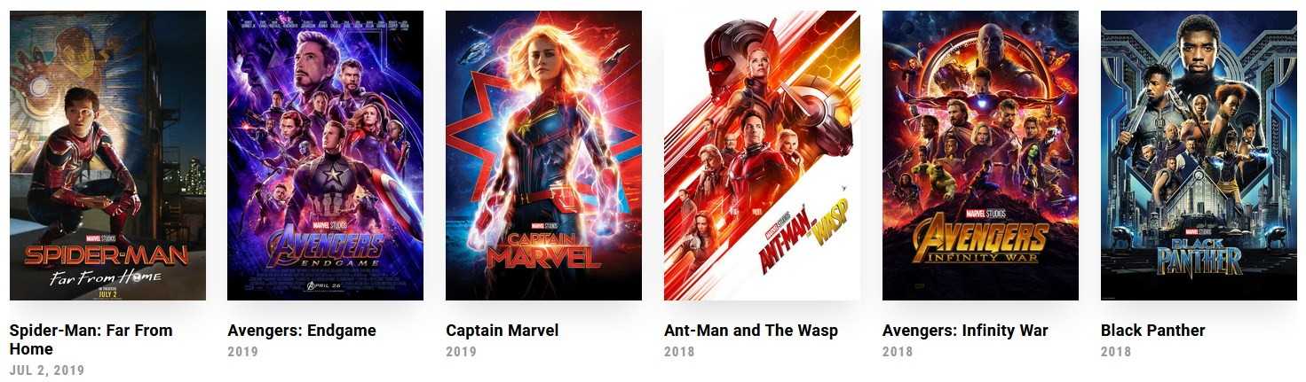 01. «Iron Man» — «Железный человек» (2008)02. «The Incredible Hulk» — «Невероятный Халк» (2008)03. «Iron Man 2» — «Железный человек 2» (2010)04. «Thor» — «Тор» (2011)05. «Captain America: The First Avenger» — «Капитан Америка: Первый мститель» (2011)06. «The Avengers» — «Мстители» (2012)07. «Iron Man 3» — «Железный человек 3» (2013)08. «Thor: The Dark World» — «Тор 2: Царство тьмы» (2013)09. «Captain America: The Winter Soldier» — «Первый мститель: Другая война» (2014)10. «Guardians of the Galaxy» — «Стражи Галактики» (2014)11. «Avengers: Age of Ultron» — «Мстители: Эра Альтрона» (2015)12. «Ant-Man» — «Человек-муравей» (2015)13. «Captain America: Civil War» — «Первый мститель: Противостояние» (2016)14. «Doctor Strange» — «Доктор Стрэндж» (2016)15. «Guardians of the Galaxy Vol. 2» — «Стражи Галактики. Часть 2» (2017)16. «Spider-Man: Homecoming» — «Человек-паук: Возвращение домой» (201717. «Thor: Ragnarok» — «Тор: Рагнарёк» (2017)18. «Black Panther» — «Чёрная Пантера» (2018)19. «Avengers: Infinity War» — «Мстители: Война бесконечности» (2018)20. «Ant-Man and The Wasp» — «Человек-муравей и Оса» (2018)21. «Captain Marvel» — «Капитан Марвел» (2019)22. «Avengers: Endgame» — «Мстители: Финал» (2019)23. «Spider-Man: Far From Home» — «Человек-паук: Вдали от дома» (2019)